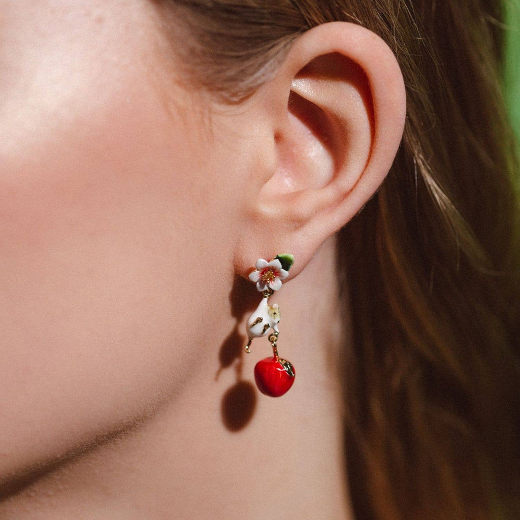 Each earring features a beautifully crafted apple blossom, with a curious little mouse peeking out from beneath the petals. A glossy red apple swings gently below, adding movement and a playful pop of colour to the design.