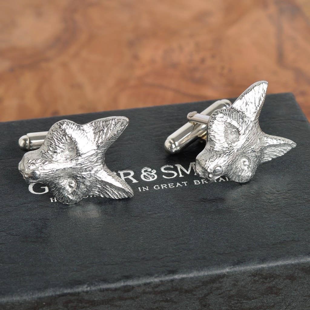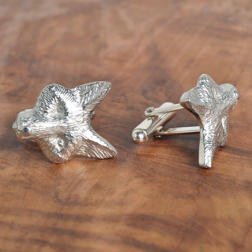 Each cufflink features a finely detailed fox head, standing 21 mm tall (7/8"), and is mounted on a high-quality silver-plated swivel bar fitting for ease of use and a secure fit.