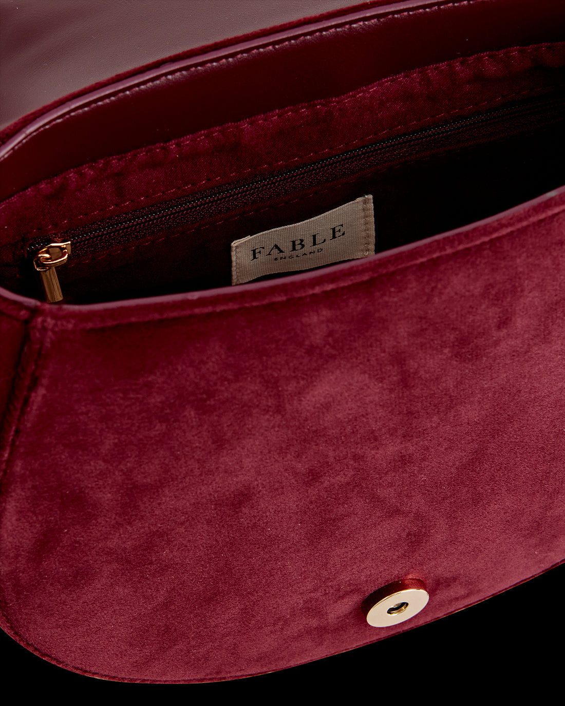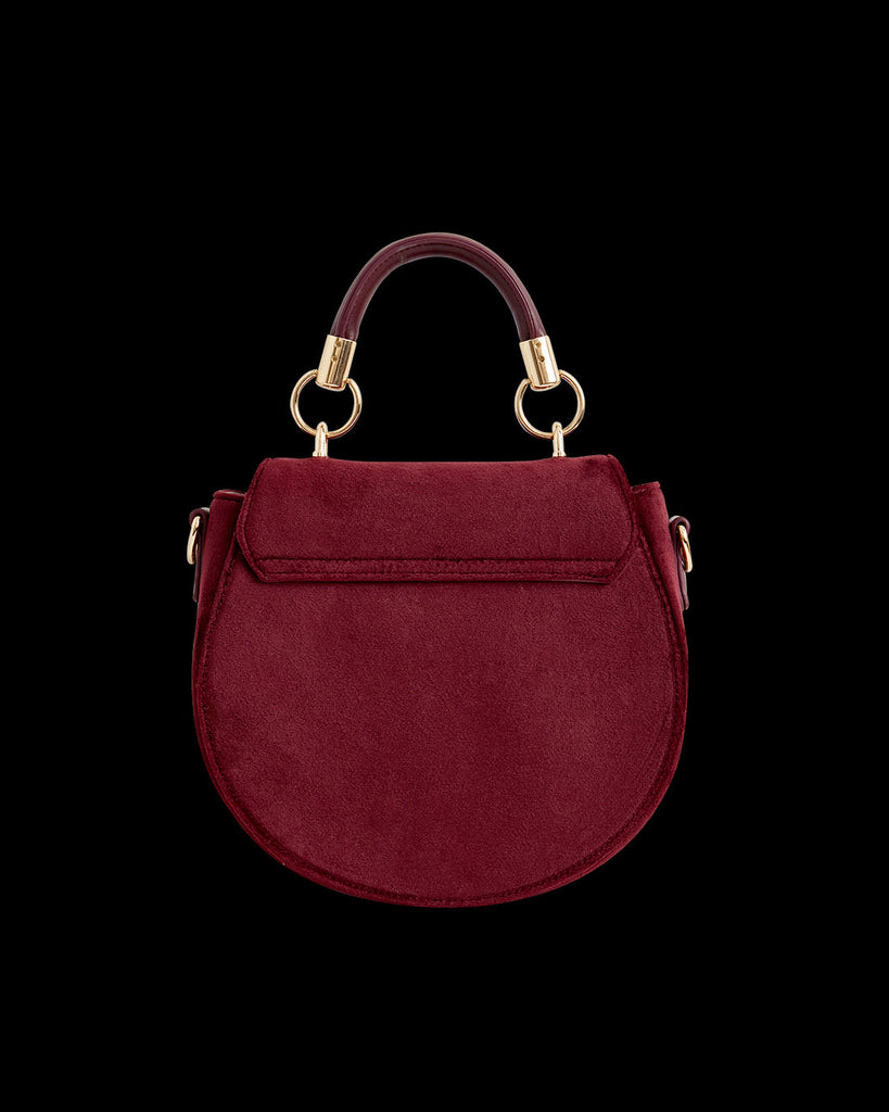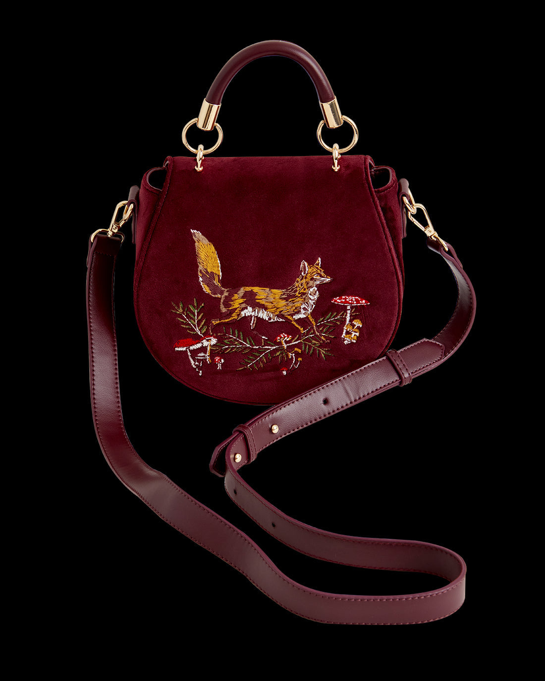 Embrace the captivating charm of nature's secrets with this Fox & Mushroom Embroidered Saddle Bag in sumptuous Redcurrant Velvet by Fable England. Crafted with care, this bag showcases a rounded, saddle-shaped silhouette adorned with intricate embroidery, depicting a fox amongst mushrooms. Designed to be both aesthetically pleasing and practical, the bag is equipped with a top handle for easy carrying and an adjustable cross-body strap for hands-free convenience.