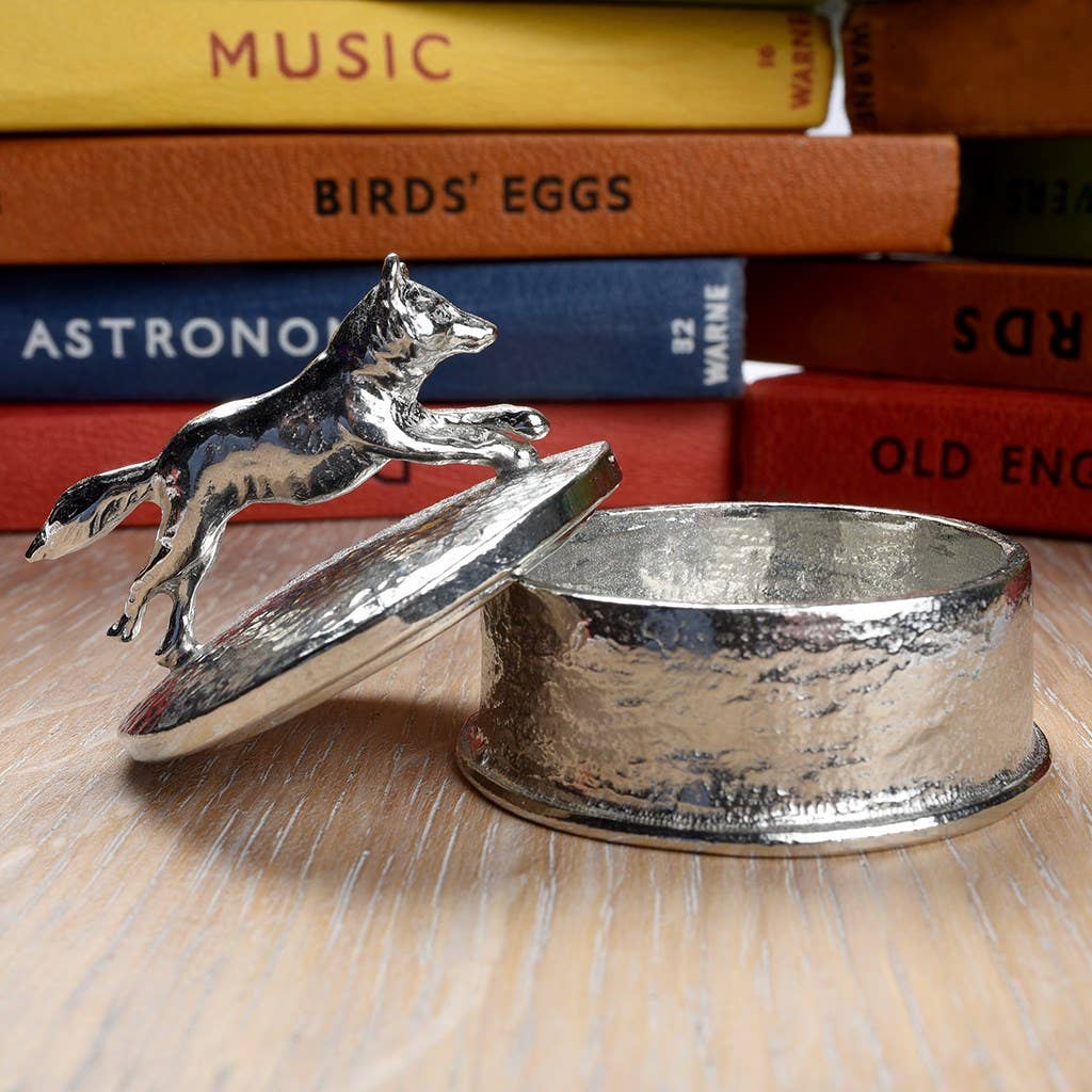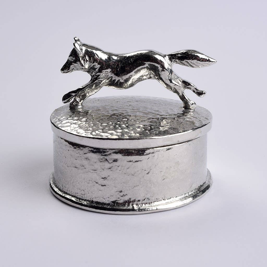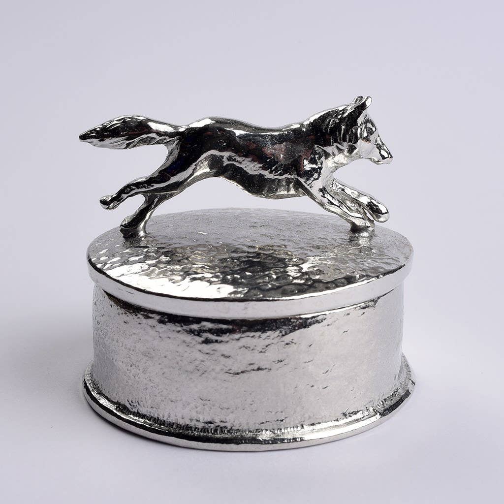 A sleek silver fox dashes across the lid of this beautifully crafted round pewter trinket box — a perfect blend of charm and craftsmanship.