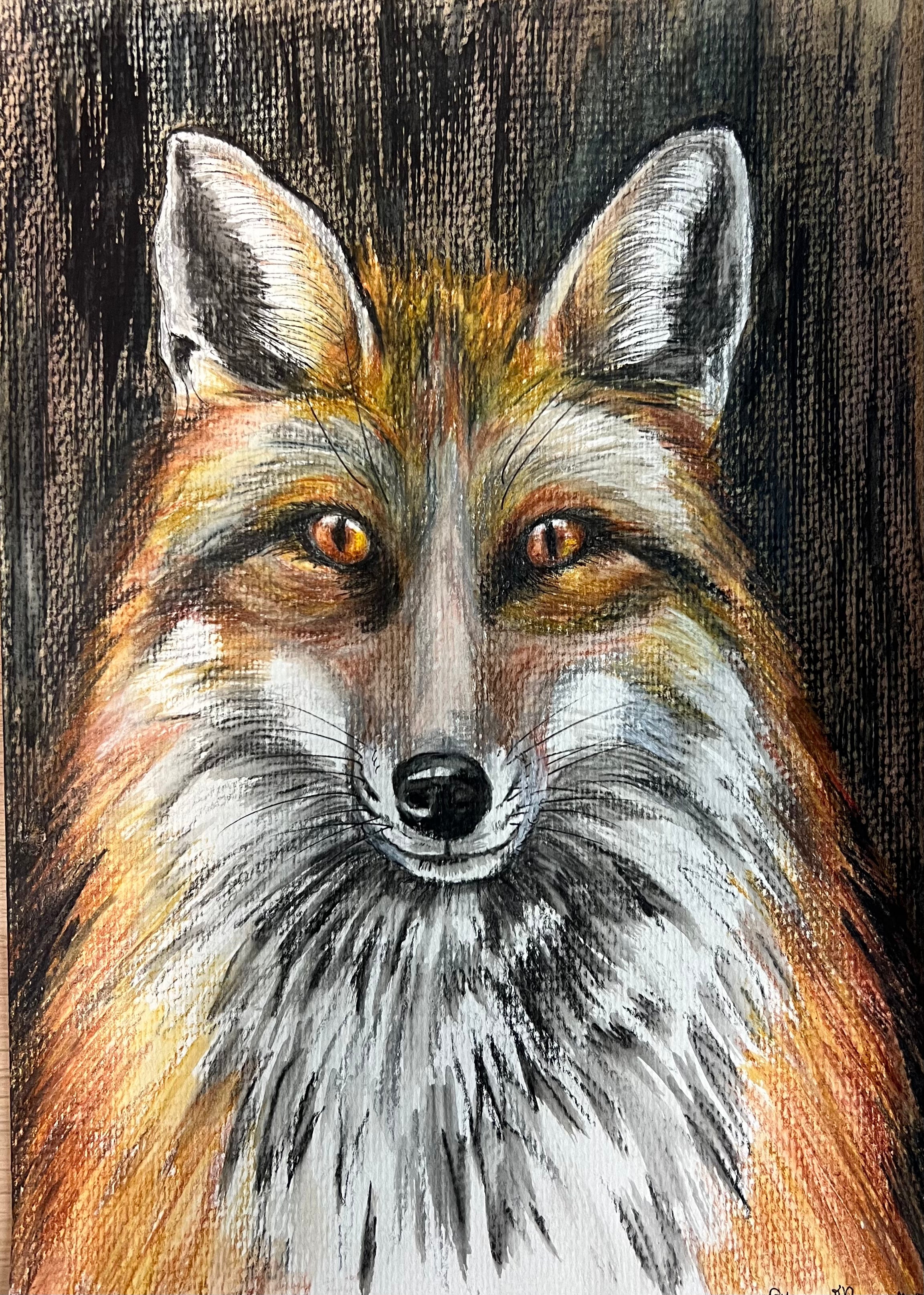 - Bold, dynamic brushwork that highlights the fox’s facial structure and fur
