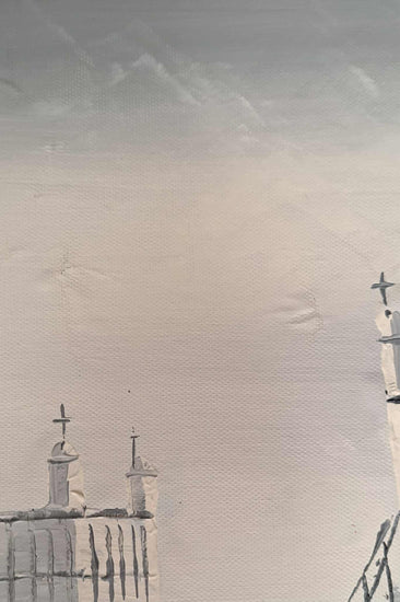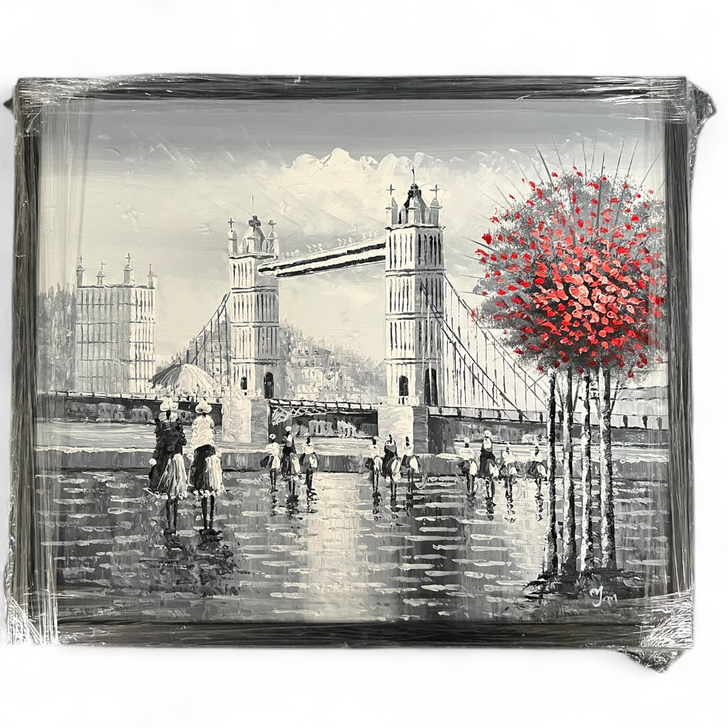 - A beautiful oil-on-canvas painting depicting Tower Bridge, recently framed and ready to hang. The composition captures the iconic bridge with a moody, atmospheric sky and a riverside scene. The work is hand-signed by the artist, though the exact name is not confirmed from the signature. Please note: during unrolling for framing, a pre-existing crack in the paint emerged in the visible area (see photos). This piece remains an original, decorative canvas suitable for interiors with a rustic or urban-modern vibe.