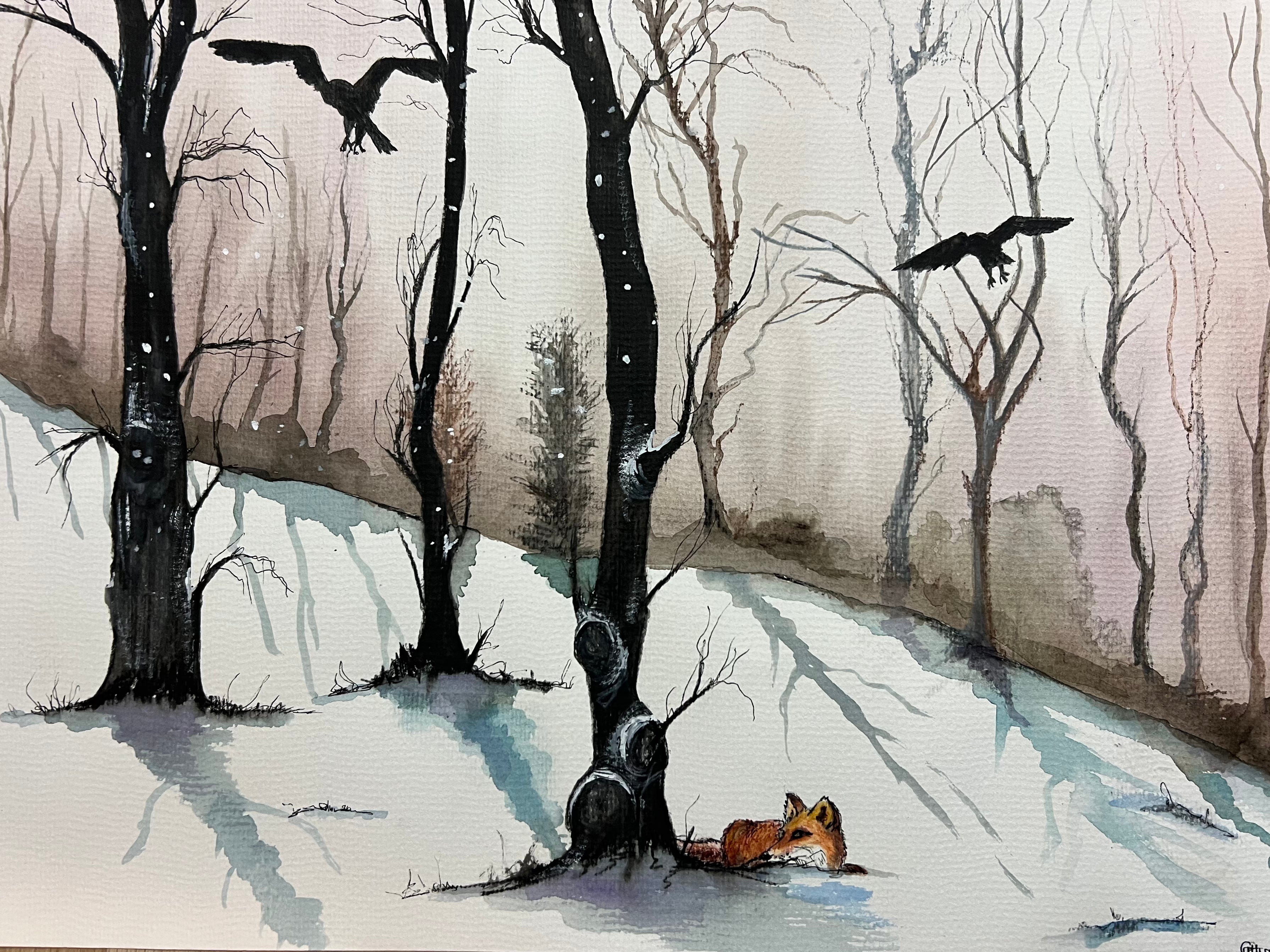- An original watercolour measuring 30 x 42 cm. This moody winter scene features a fox resting at the base of a bare tree, with a stark, snow-covered path winding through a forest of skeletal trees. A pair of birds glide overhead, adding a touch of movement to the tranquil landscape. Subtle washes convey a cold, hush-filled day, while the fox’s warm fur provides a gentle focal point. Signed by the artist and created on high-quality watercolour paper.